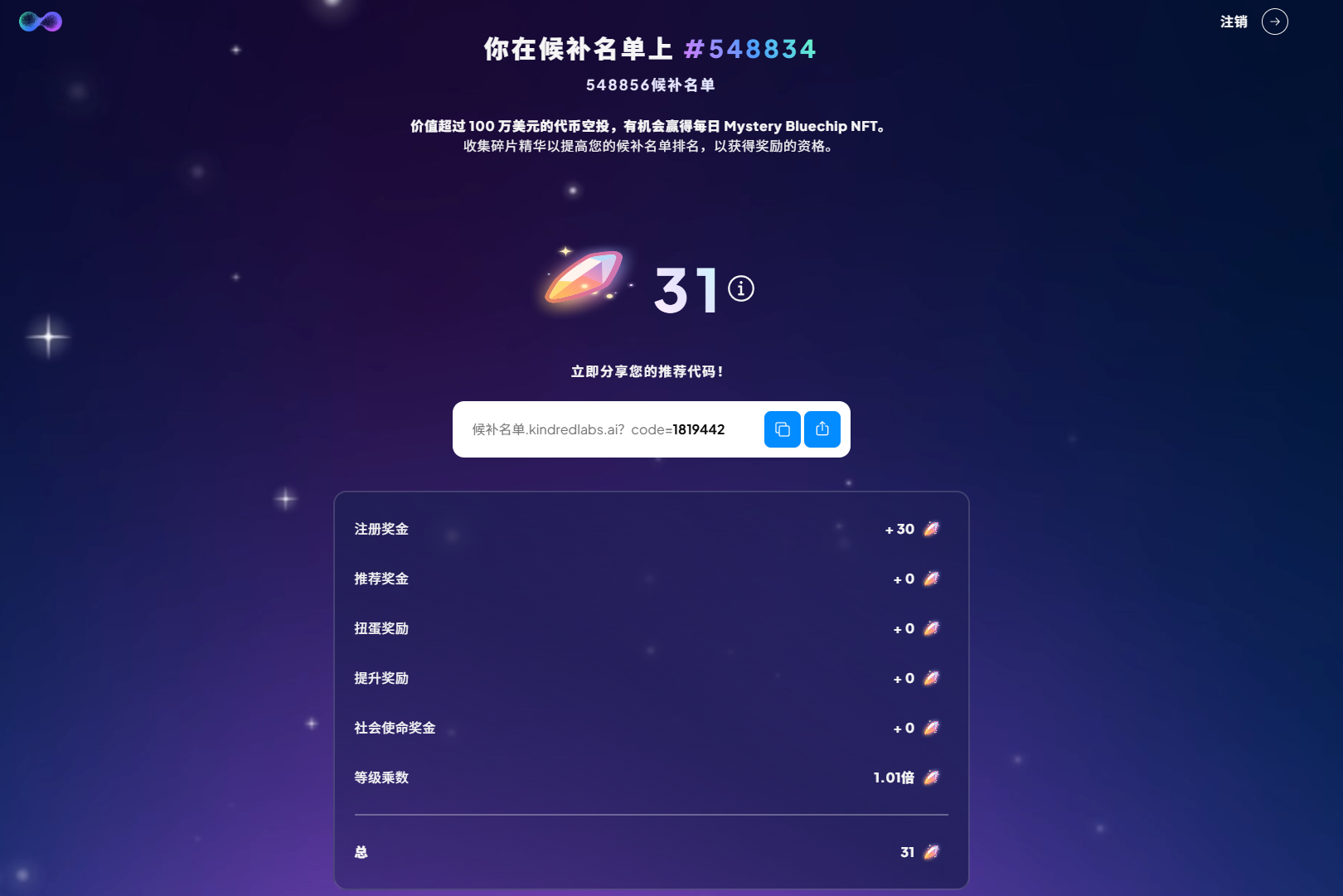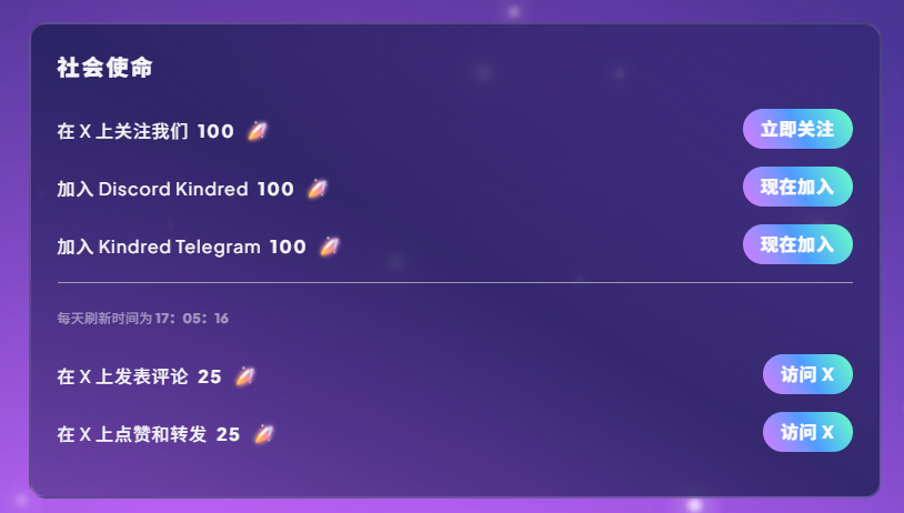 通过注册完成候补名单任务的成员,可以获得超过 100 万美元的 $KIN 空投。另外 Kindred 在 9 月 16 号也会上线 kaito 的排行榜,趁现在人不多可以先卷起来。