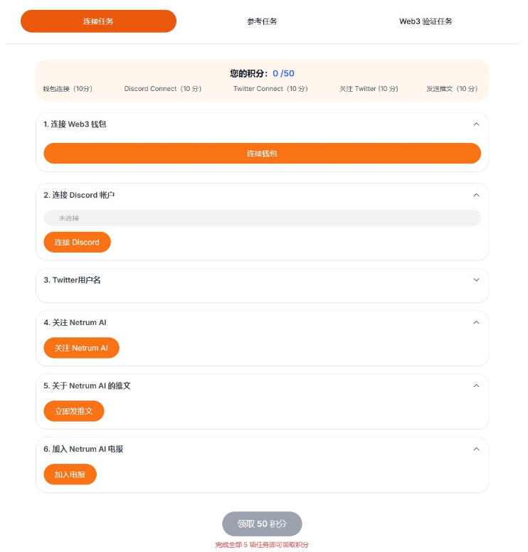 2.完成任务后领取50积分,discord任务需要自己先去获得early access role,然后再授权。